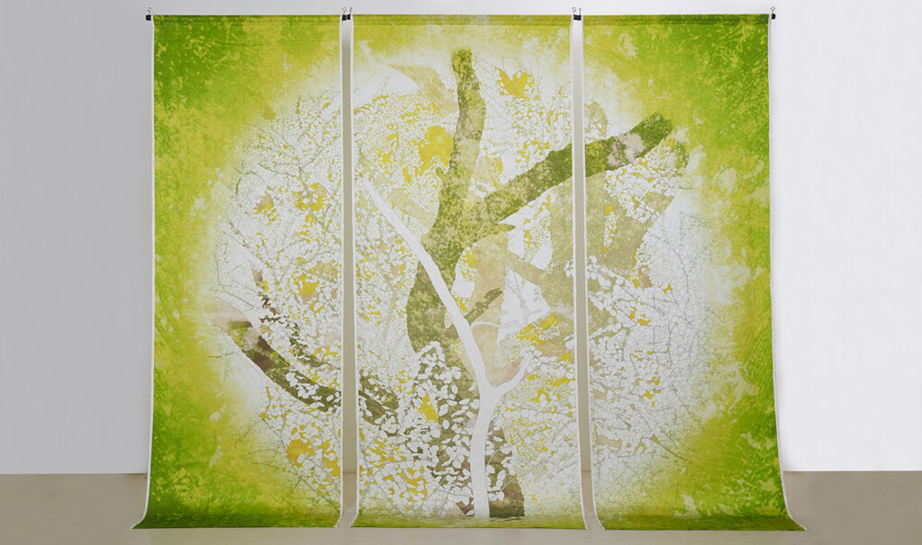 森の中、大カツラを仰ぎ見た時の葉が陽の光に透けるようなイメージが、シルクの生地にインクジェットプリントで染め、蒸しをして染料を 定着して出来上がった作品を窓辺に展示することで表現され、風に吹かれる作品は、あたかも下谷の大カツラの前にいる錯覚を覚えました。